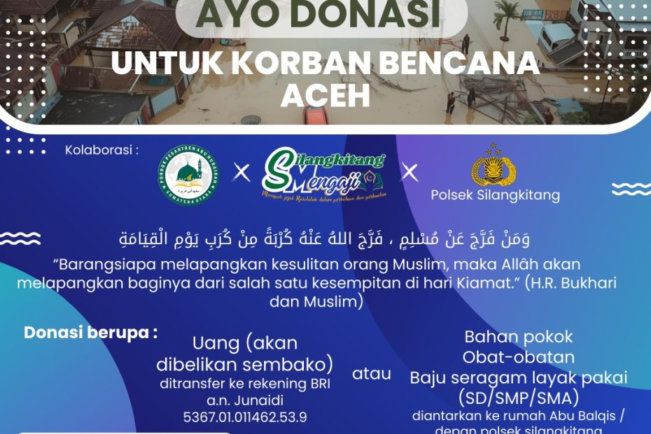 šOPEN DONASI PEDULI ACEH 𤲠Innalillahi wa inna ilaihi rajiāunSaudara-saudara kita di Aceh sedang diuji dengan musibah bencana alam. Saatnya kita hadir, saling menguatkan, dan berbagi kebaikan. š¤ InsyaAllah Pondok Pesantren Abu Hurairah Rantauprapat berkolaborasi dengan:⢠Silangkitang Mengaji⢠Polsek Silangkitang… Peduli Aceh dan Sumatera
